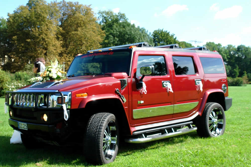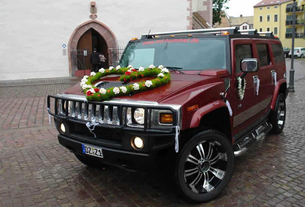 Hummer H2 in weinrot und festlich geschmückt (mit Herz) steht mit Fahrer im dunklen Anzug für Sie bereit: